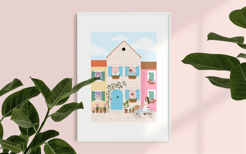Dora: Volim koristiti vesele, jarke boje za ljetne tematike u svojim ilustracijama – uglavnom dalmatinske motive i gradove, dok se pastelnim bojama koristim za ilustracije u zimskim i jesenskim temama. Trudim se prenijeti tu neku vibru trenutačnog sezonskog perioda i osjećaja u svima nama.